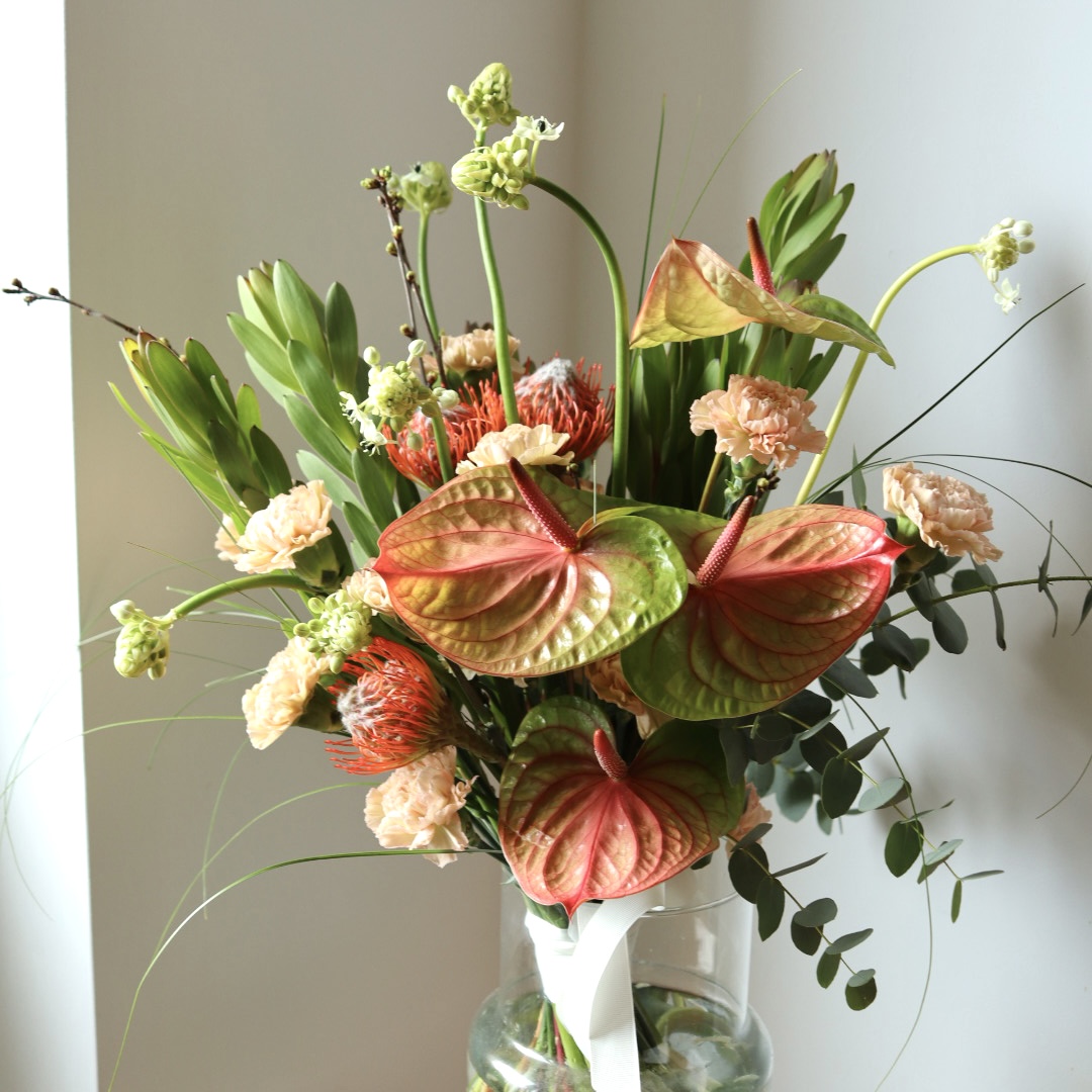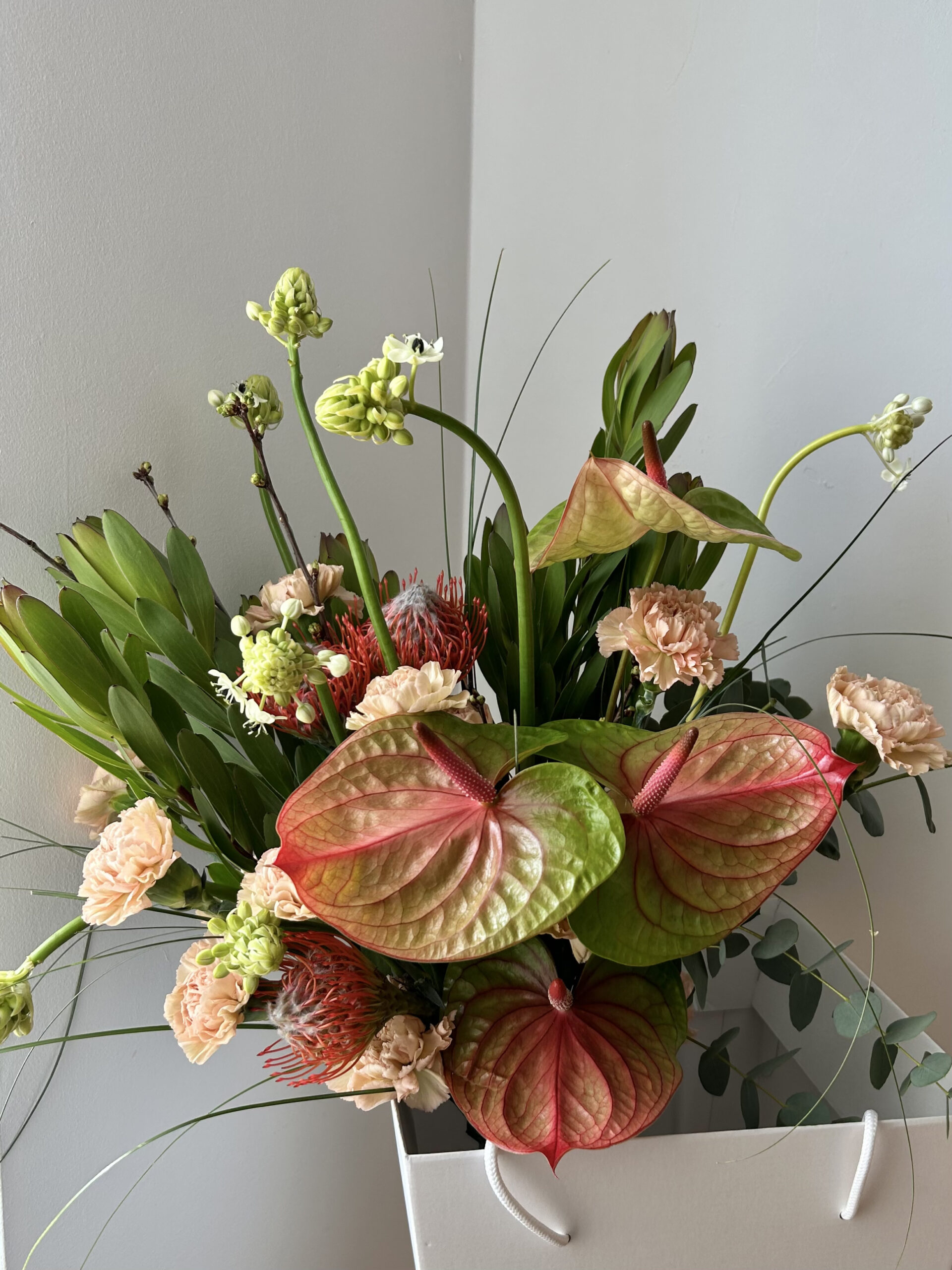 Skład: anturium, leucodendron, leucosperum, ornitogalum, gozdziki, sezonowe dodatki.