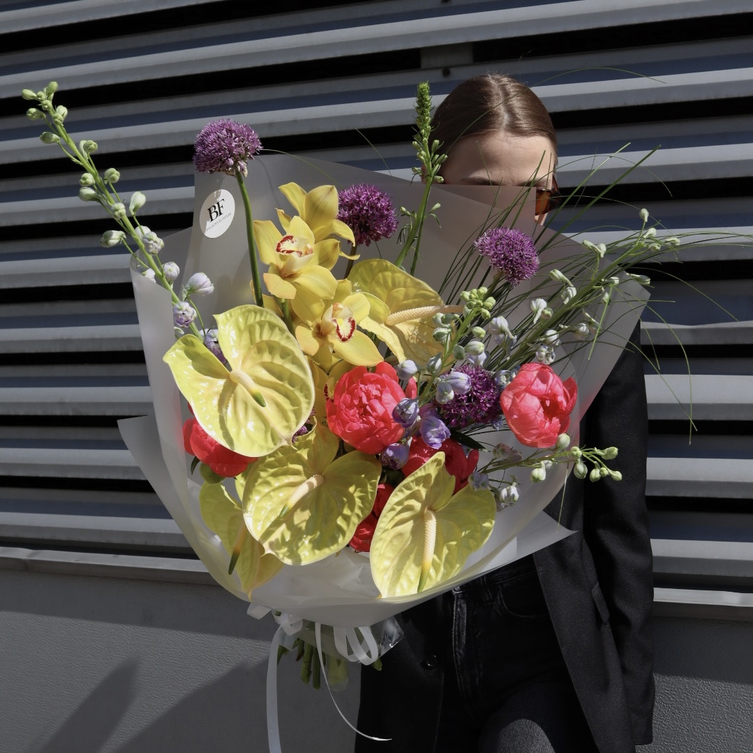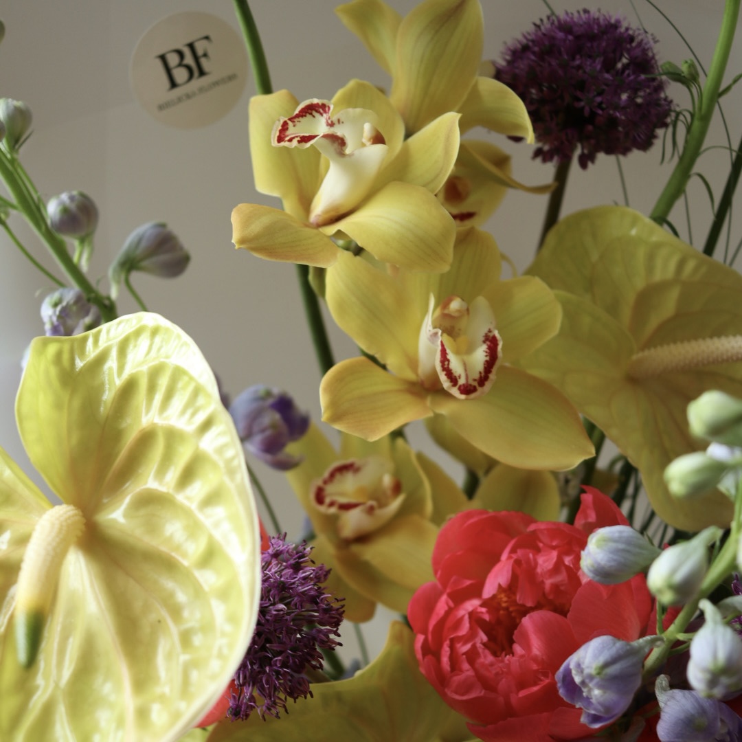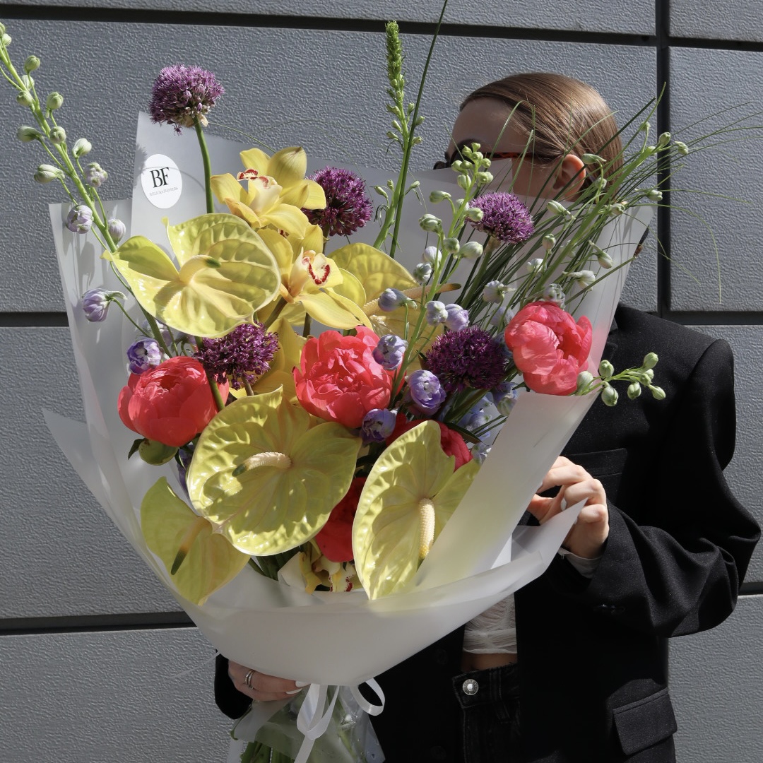 Skład: piwonie koralowe, cymbidium, anthurium, delphinium, sezonowe dodatki.